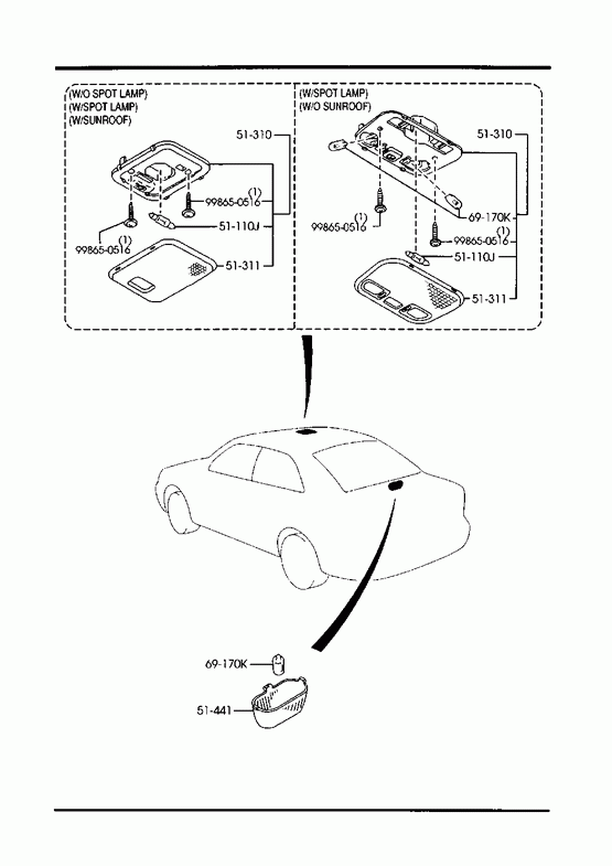 W/O SUNROOF€ 11,93 B25K51311 1 W/O SPOT LAMP € 11,93 » 51441 LENS Part Number Qty. Specifications Price B13051441 1 A (B100-51-441) € 4,85 » 69170K BULB,INTERIOR MIRROR Part Number Qty. Specifications Price 997016050 3 12V 5W