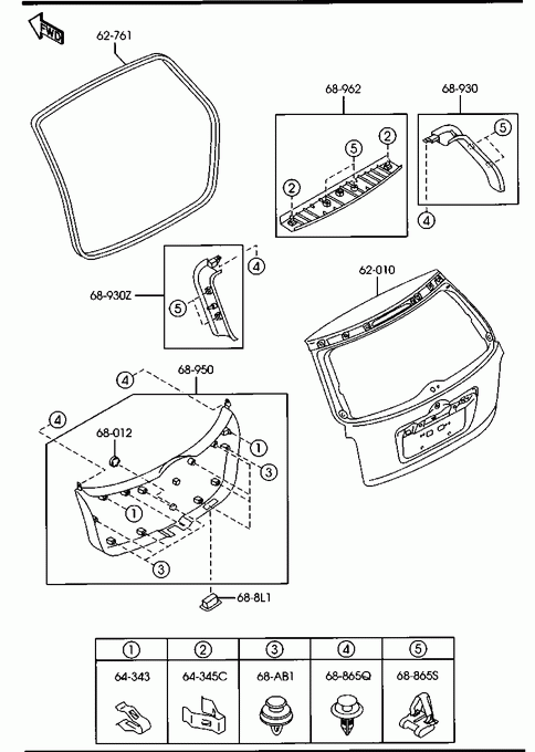 ER*9**171647-» 62761 WEATHERSTRIP,LIFT GATE Part Number Qty. Specifications Price EG2162761A 1 » 64343 SPRING Part Number Qty. Specifications Price J00164345 2 € 2,04 » 64345C SPRING,UPPER PLATE Part Number Qty. Specifications Price LB8264345 2 € 1,41 » 68012 CAP,HOLE Part Number Qty. Specifications Price EG2168949 1 » 68865Q FASTENER Part Number Qty. Specifications Price GJ2168885B 4 » 68865S CLIP,TRIM Part Number Qty. Specifications Price GJ1268865 6 € 1,88 » 688L1 RECESS,LIFT GATE TRIM Part Number Qty. Specifications Price GJ6A68966 1 » 68930 TRIM(R),LIFT GATE-SIDE Part Number Qty. Specifications Price EG2168940A 1 » 68930Z TRIM(L),LIFT GATE-SIDE Part Number Qty. Specifications Price EG2168950A 1 » 68950 TRIM,LIFTGATE-LOWER Part Number Qty. Specifications Price EG2168960A 1 » 68962 TRIM,LIFTGATE-UPPER Part Number Qty. Specifications Price EG2168930A 1 » 68AB1 FASTENER Part Number Qty. Specifications Price E12068AB1 10 € 2,59