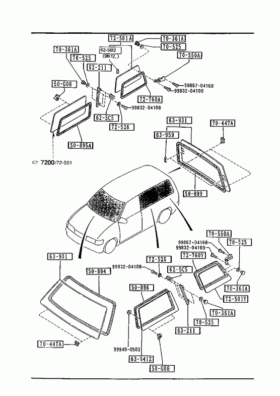 BLUE» 63931 GLASS,BACK WINDOW Part Number Qty. Specifications Price LA036393XA 1 » 63941Z GLASS(L),SIDE-WINDOW Part Number Qty. Specifications Price LA0173510A 1 € 98,51 » 63959 TERMINAL,BACK WIND. GLASS Part Number Qty. Specifications Price FB0163959 2 € 8,78 » 70361A NUT,GLASS CLAMP Part Number Qty. Specifications Price 041972525 6 € 5,41 » 70447A SPACER'A' Part Number Qty. Specifications Price H26050891 4 € 2,20 » 70525 WASHER Part Number Qty. Specifications Price 041972522 6 A (S232-51-906) € 1,85 » 70550A LOCK,QTR.WINDOW Part Number Qty. Specifications Price D00172310 2 AN (D001-72-310A) € 15,20 » 72501A GLASS(R),QTR.WINDOW Part Number Qty. Specifications Price LA01625B1B 1 A (LA01-62-5B1C)